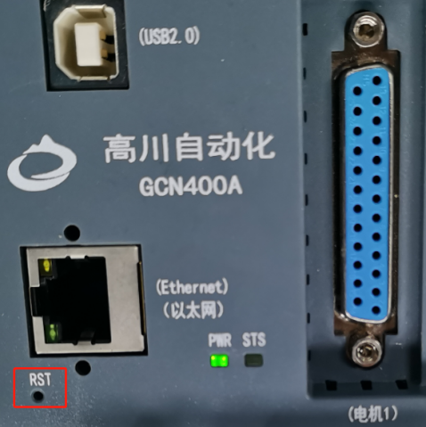 (5)给控制器上电前,用一根小针,插进以太网口旁边标注有RST的小孔,如图红色框中区域