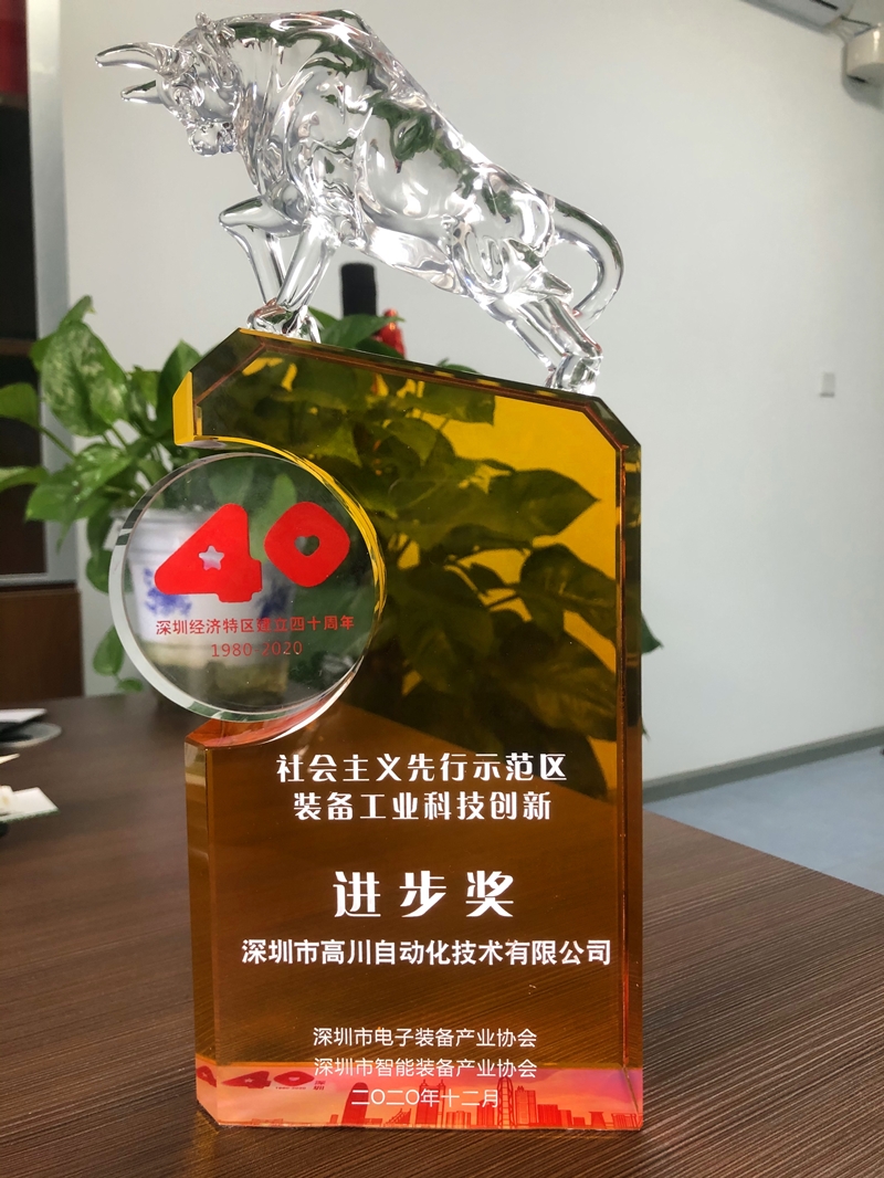 由深圳市电子装备产业协会、深圳市智能装备产业协会主办 的“2020深圳经济特区建立 40 周年社会主义先行示范区装备工业科技创新奖”评选活动,经过行业评价、专家评审、结果公示等环节,高川自动化荣获“社会主义先行示范区装备工业科技创新进步奖”。