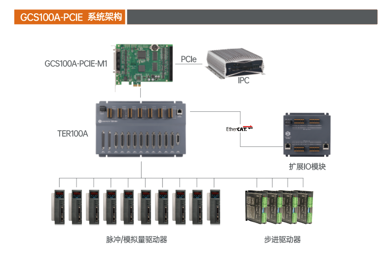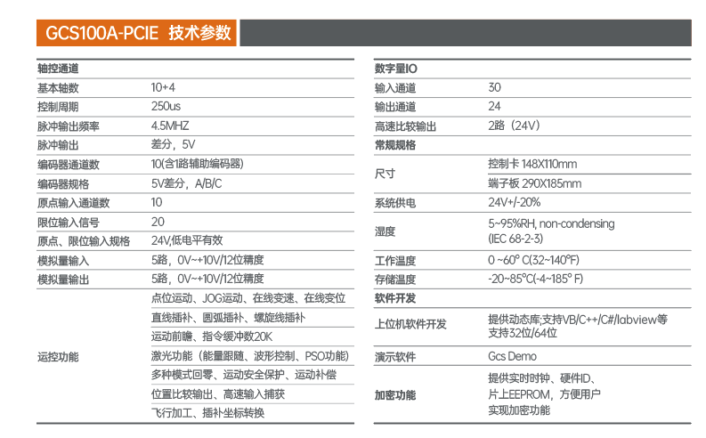 GCS-PCIE系列多轴运动控制卡是一款集运动控制技术和网络通讯技术于一体的高性能插卡式运动控制卡。控制卡可以控制1-16轴脉冲/模拟量伺服电机,同时支持EtherCAT IO模块扩展,为用户提供了多轴数、多IO点数的脉冲/模拟量/总线控制解决方案。